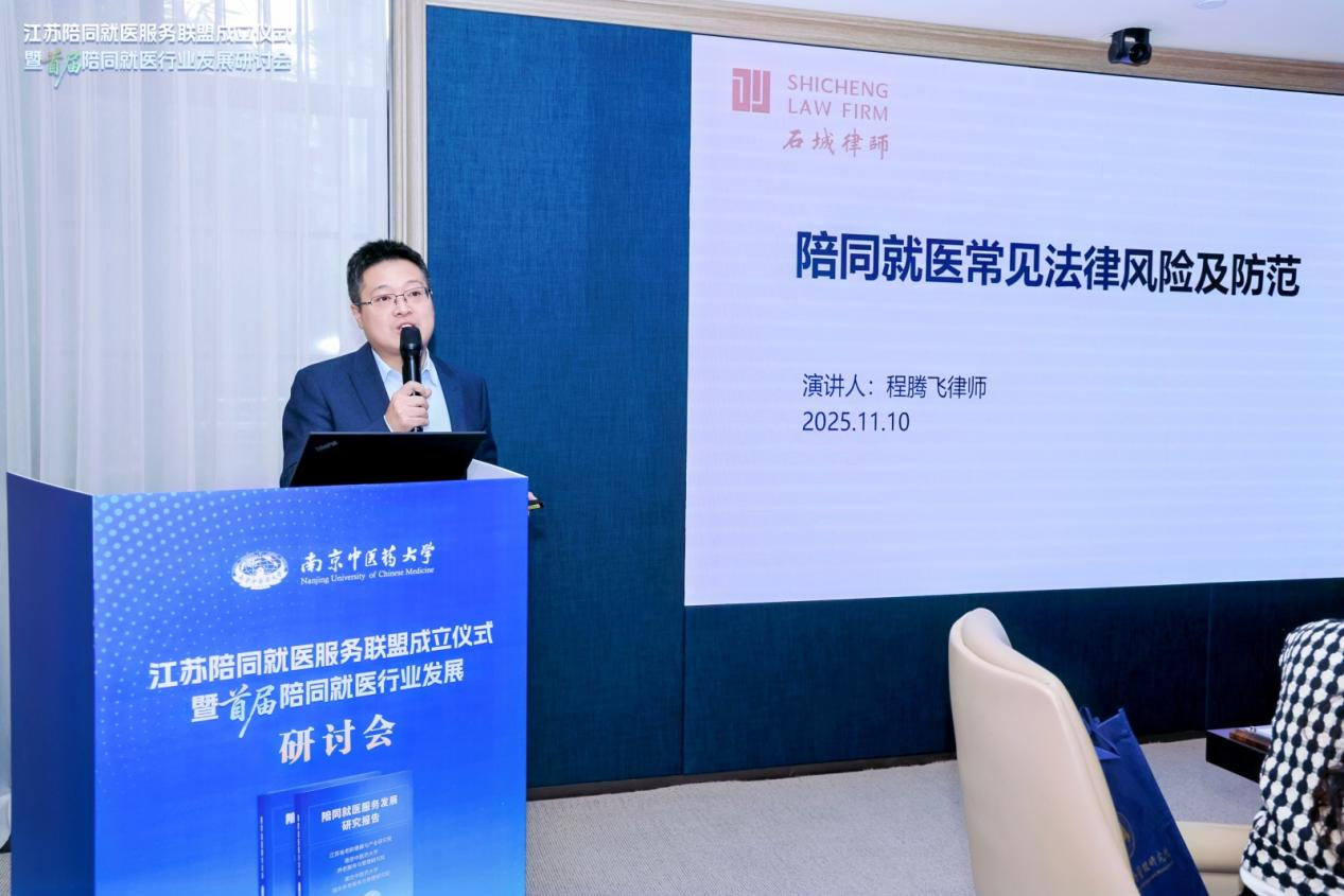 在此背景下,江苏石城律师事务所作为联盟的重要成员单位正式加入,本所合伙人程腾飞律师代表律所出席会议并作专题发言,深入剖析了陪同就医服务的法律风险环境,并提出系统性建议:推动陪诊师职业资格认证,明确法律地位与服务边界;加强行业自律,建立全国性协会并制定服务规范;完善法律法规,出台专项管理办法;引导购买职业责任保险,分散执业风险。其专业见解获得了与会代表的关注与认同。