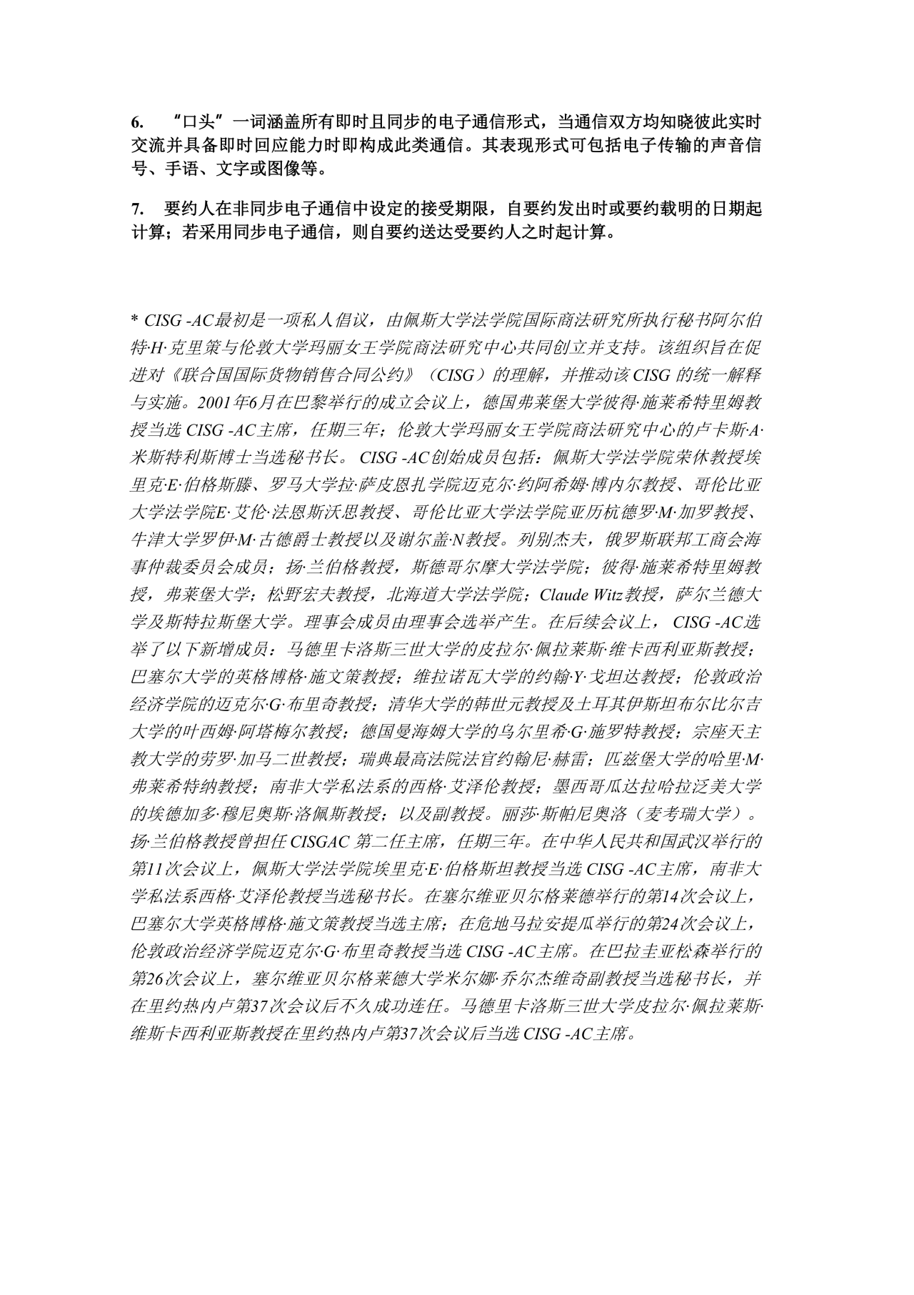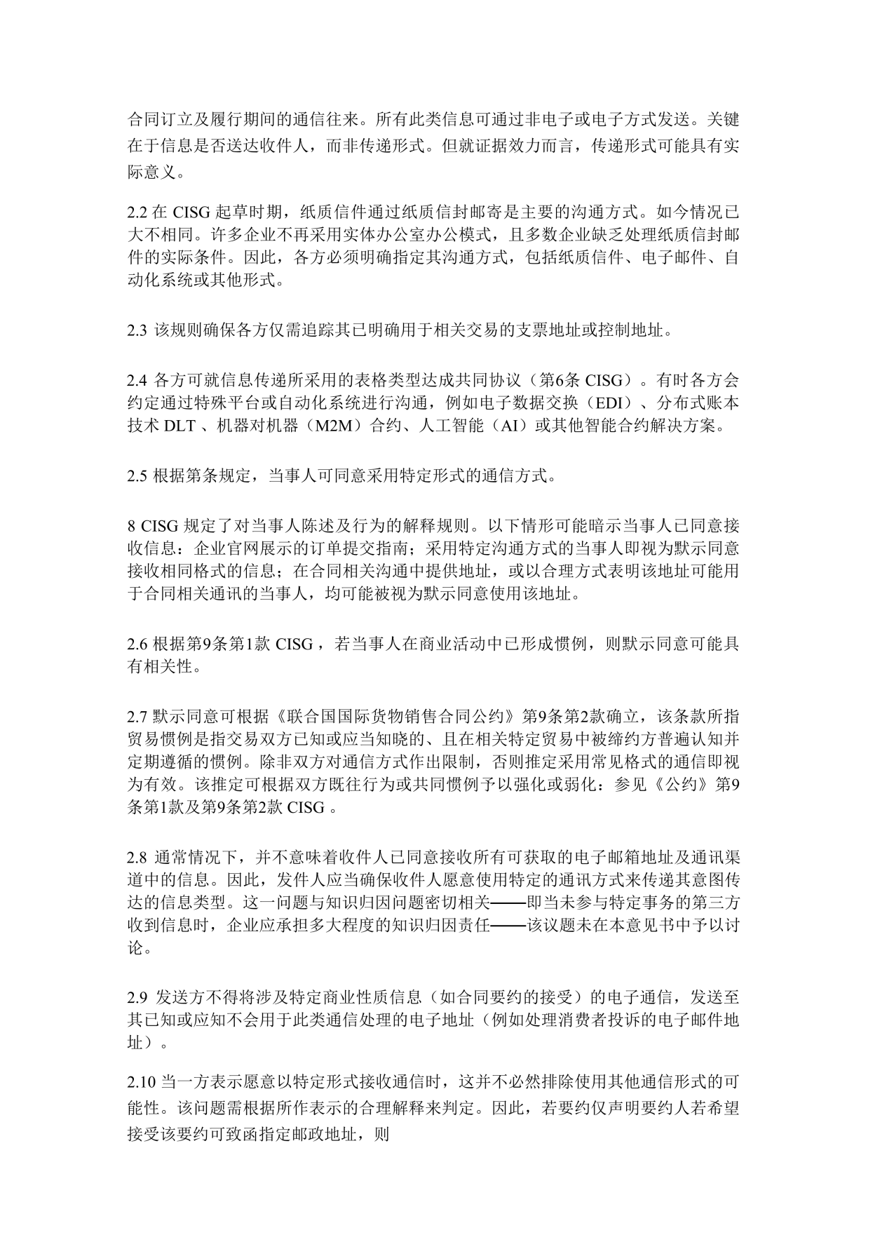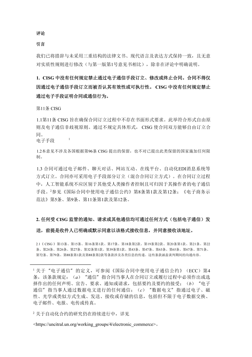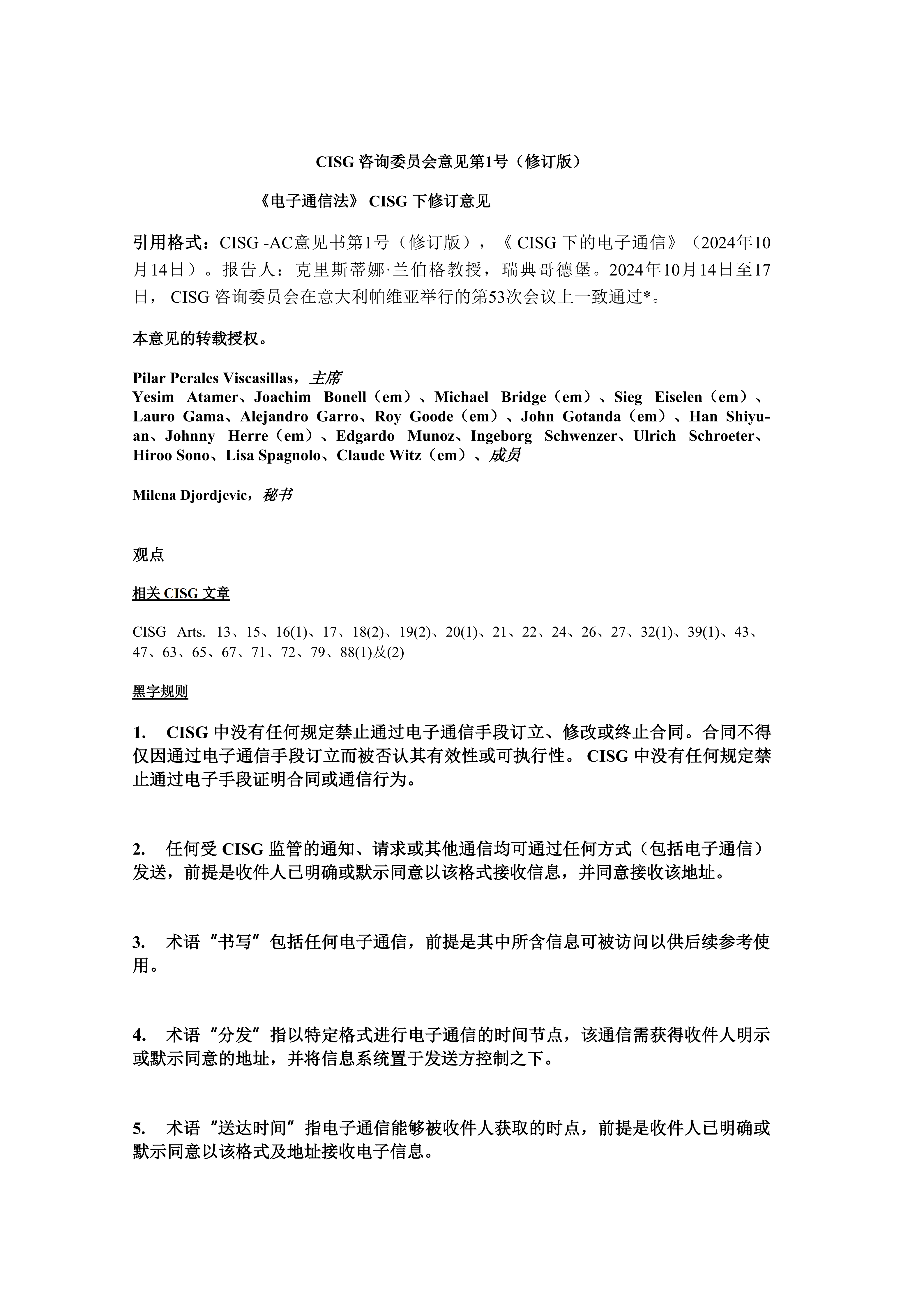 本公众号在此前石城涉外丨CISG咨询委员会及CISG咨询委员会意见一文中,对CISG咨询委员会及CISG咨询委员会意见进行简要的介绍。CISG咨询委员会第1号意见于2003年形成,于2024年进行修订,第1号意见主要为有关联合国国际货物销售合同公约下的电子通讯意见,该意见的内容主要为电子合同的订立方式及效力、电子通知的送达、风险,该意见明确通过电子通讯工具订立、修改、终止合同的效力与传统书面的方式具有同等效力,电子通讯方式送达的重点在于信息传达至接收人,电子送达以进入接收者服务器为生效的节点,采取电子通讯方式订立合同、送达的双方要对电子通讯方式达成明示或默示的同意。本文将对翻译、介绍如下: