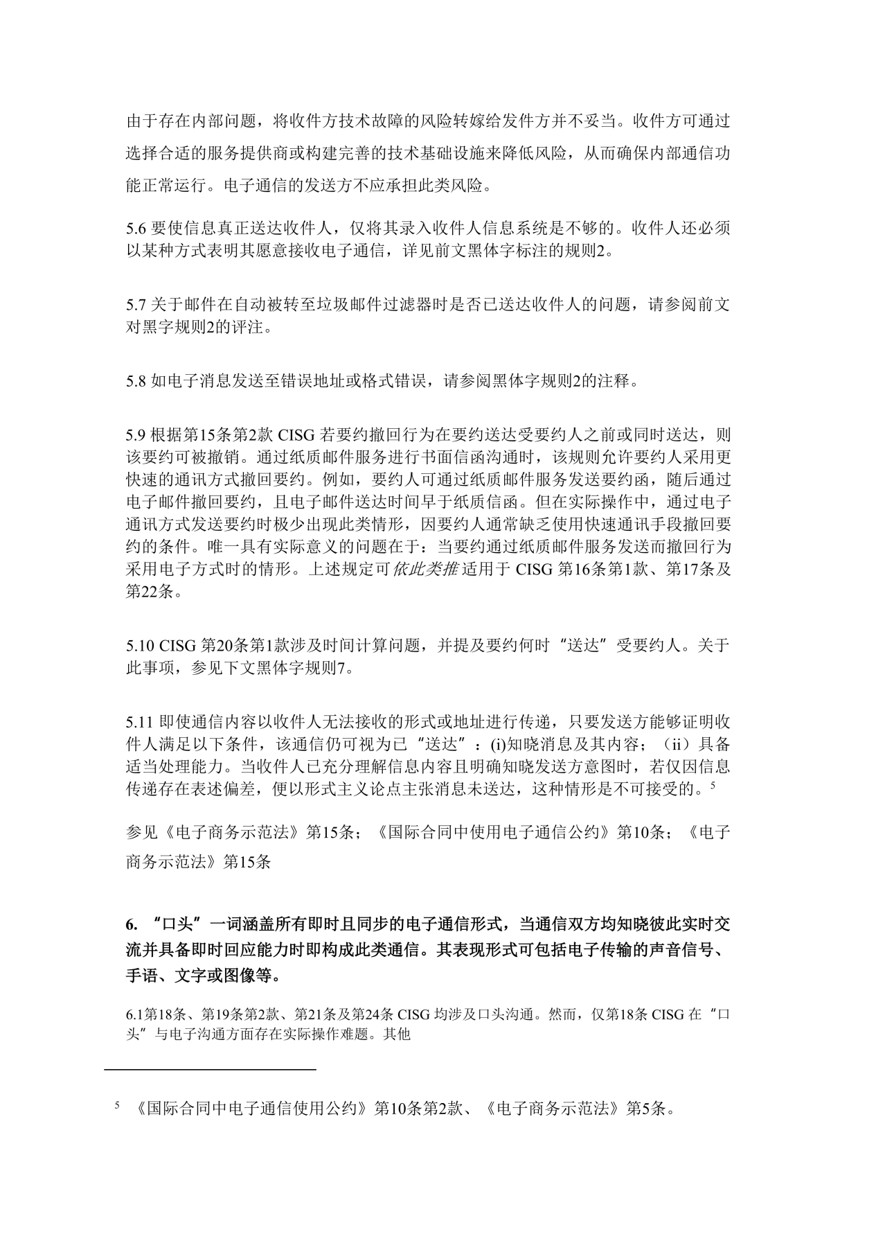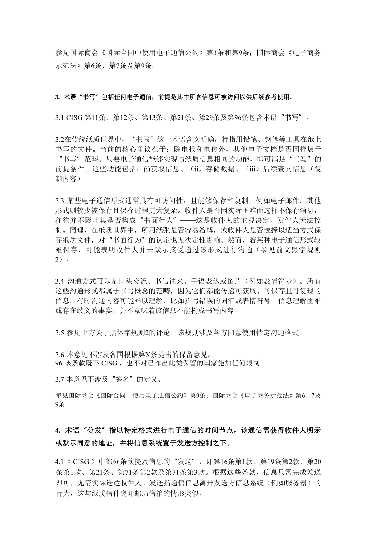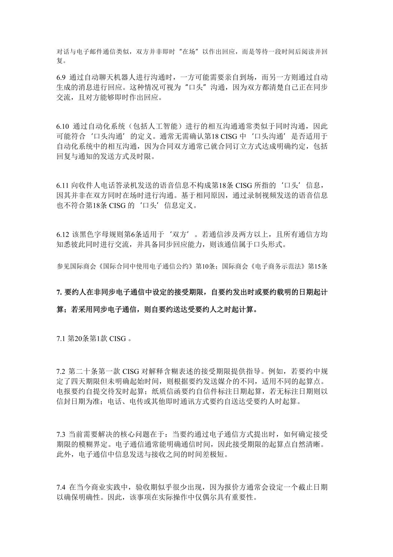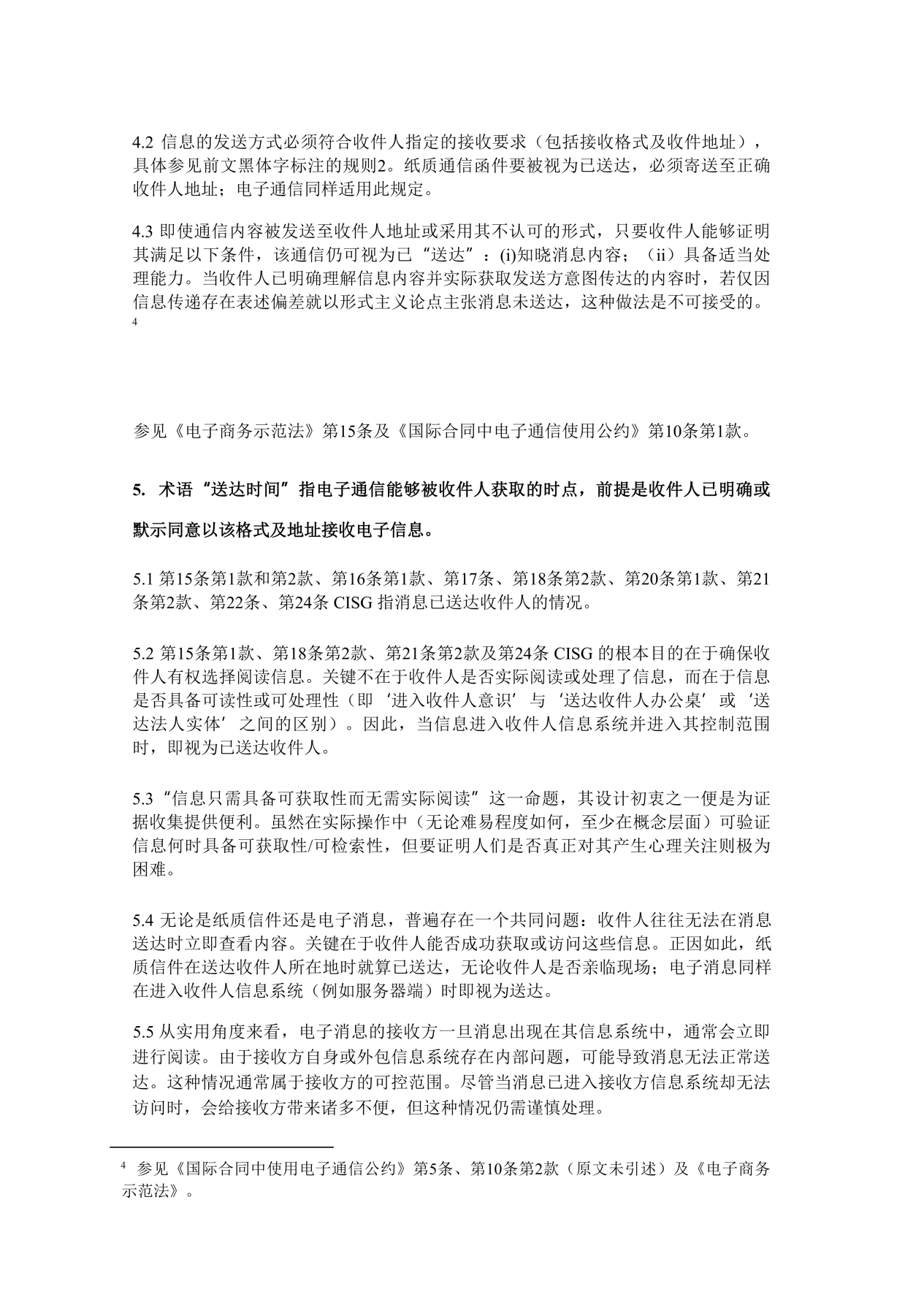 本公众号在此前石城涉外丨CISG咨询委员会及CISG咨询委员会意见一文中,对CISG咨询委员会及CISG咨询委员会意见进行简要的介绍。CISG咨询委员会第1号意见于2003年形成,于2024年进行修订,第1号意见主要为有关联合国国际货物销售合同公约下的电子通讯意见,该意见的内容主要为电子合同的订立方式及效力、电子通知的送达、风险,该意见明确通过电子通讯工具订立、修改、终止合同的效力与传统书面的方式具有同等效力,电子通讯方式送达的重点在于信息传达至接收人,电子送达以进入接收者服务器为生效的节点,采取电子通讯方式订立合同、送达的双方要对电子通讯方式达成明示或默示的同意。本文将对翻译、介绍如下:
