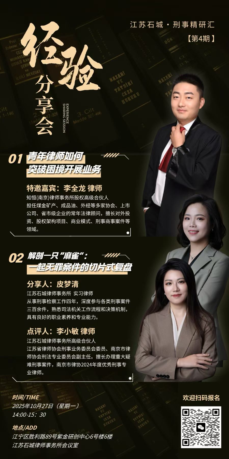 本次刑事精研汇的成功举办,不仅为律师们带来了丰富的专业知识与实战经验,更强化了律所内部的专业交流氛围。未来,江苏石城律师事务所刑事委员会将继续围绕刑事业务热点、难点问题,持续开展高质量的精研活动,为律师成长赋能,为律所发展蓄力。
