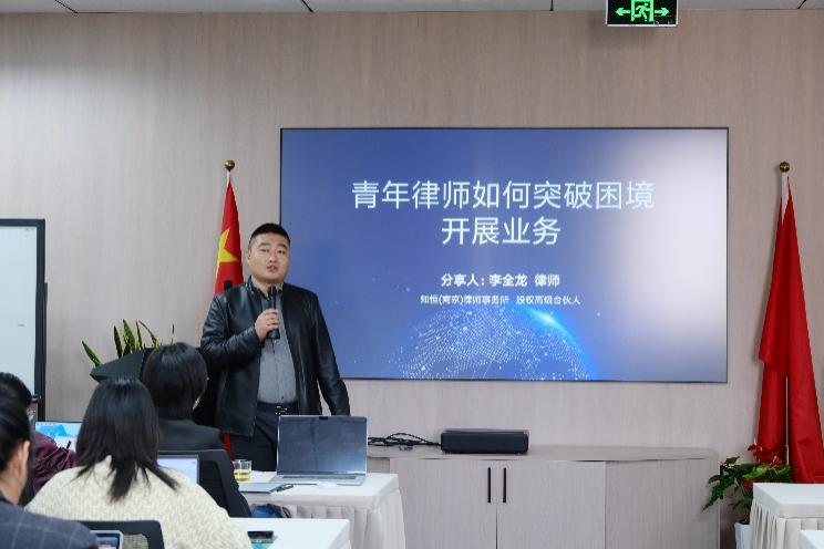 活动首个环节,特邀广东知恒(南京)律师事务所股权高级合伙人李全龙律师带来“青年律师如何突破困境开展业务”主题分享。李律师结合自身多年执业经历,以“实战者”的视角,为在场青年律师提供了极具指导性的发展思路。他提到,青年律师初期需重视案件量积累,通过处理各类案件夯实法律基础、提升实务能力;同时要保持对市场动态的敏感性,密切关注社会发展趋势下的业务需求变化——相较于偶发性诉讼案源,贴合社会发展方向的新兴业务更能为律师带来长期稳定的案源支撑,面对此类机会时需敢于尝试、主动突破,同时做好执业风险防控。此外,李律师特别强调青年律师需转变“传统法律思维”,不能仅局限于从法律角度解决问题,而应学会从客户需求出发,深入挖掘客户潜在的法律服务需求,拓展服务维度与深度,从而在竞争中形成差异化优势。